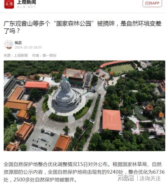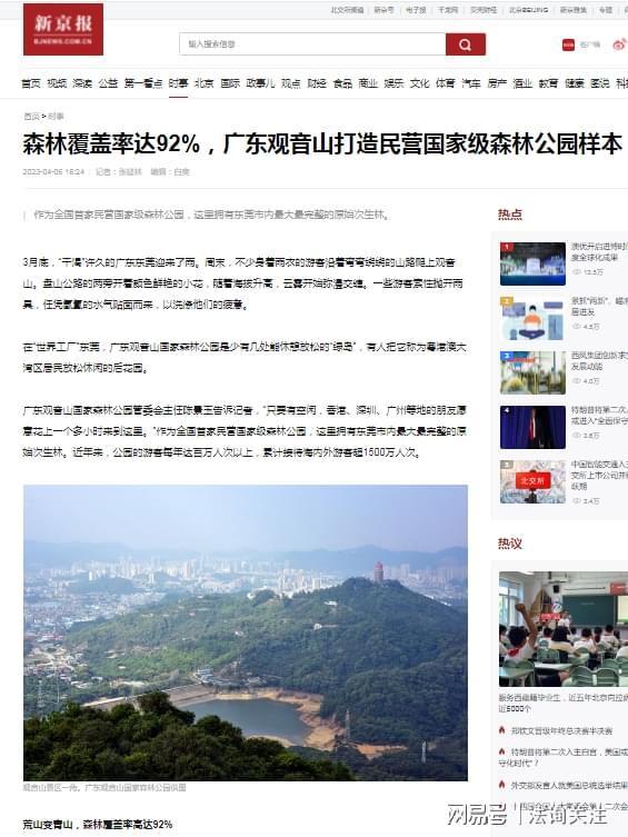 2023年4月6日新京报以《森林覆盖率达92%,广东观音山打造民营国家级森林公园样本》为题予以报道 全网为观音山国家森林公园位列撤销的自然保护地名单鸣不平 在获悉广东观音山国家森林公园位列撤销的自然保护地名单中,国内多家媒体及网络均为其鸣不平,引起了广泛关注。