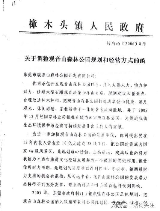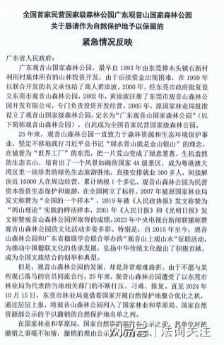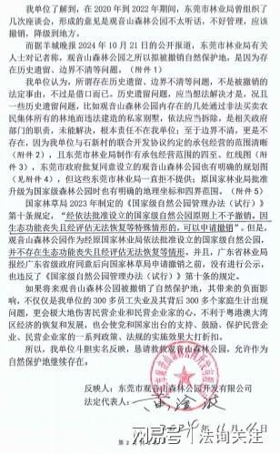 全国首家民营国家级森林公园广东观音山国家森林公园关于恳请作为自然保护地予以保留的紧急情况反映 广东省人民政府: 广东观音山国家森林公园,最早自1993年由东莞樟木头镇石新村利用村集体所有的山林投资开发,由于后续资金出现困难,在1999年以联合开发的名义承包给了商人黄淦波。2000年,经东莞市政府批复设立东莞市观音山森林公园,2002年,黄淦波注册了东莞市观音山森林公园开发有限公司,专门负责投资开发经营。2005年,原国家林业局批准设立了观音山国家级森林公园,定名为“广东观音山国家森林公园”(以下简称观音山森林公园),自此成为全国首家民营国家级森林公园。 25 年米,观音山森林公园一直致力于森林资源和生态环境保护事业,坚定不移地践行习近平总书记“绿水青山就是金山银山”的理念,在被誉为“世界工厂”的东莞,把一片荒山变成了绿意葱葱、生机盎然的生态名山,培育出了一个风景如画的国家4A级景区,成为粤港澳大湾区里一块珍贵的绿色生态旅游胜地,直接安排就业300多人,间接解决近10000人在周边经营,累计纳税1个多亿。观音山森林公园为民营资本投资生态保护和旅游,在全国树立了标杆。2007年被原国家林业局发文称赞为“全国的一个样本”,2019年被《人民政协报》发文称赞为“两山理论”实践的鲜活样本,2001年《人民日报》和《光明日报》发文称赞观音山森林公园所取得的成绩。2023年中央电视台新闻联播称赞观音山森林公园的文化活动多姿多彩。特别是,自2015年至今,观音山森林公园和广东省楹联学会联合举办的“观音山上观山水"征联活动,为推动中国楹联文化的传承发展,弘扬中华传统文化做出了积极贡献,成为全国文旅结合的创举和典型。 但是,观音山森林公园的发展,却是异常艰难曲折。由于不愿与某些现已落马的官员同流合污,25年来,观音山森林公园遭受了以东莞市林业局为代表的当地相关部门的不断打压、刁难、报复。直至2024年10月15日,东莞市林业局竟借着国家开展自然保护地整合优化之机,通过层层上报,将观音山森林公园列入了国家林业和草原局、国家自然资源部公示的予以撤销的自然保护地名单之列。 在国家林业和草原局、国家自然资源部发布公示之前,我单位对被撤销之事毫不知情,撤销的理由公示里也没有说明。 我单位了解到,在2020年到2022年期间,东莞市林业局曾组织了几次座谈会,形成的意见是观音山森林公园不太听话,不好管理,应该撤销,降级到地方。 而据羊城晚报2024年10月21日的公开报道,东莞市林业局有关人士对记者称,观音山森林公园之所以拟被撤销自然保护地,是因为存在历史遗留、边界不清等问题。 我单位认为,所谓存在历史遗留、边界不清等问题,不是被撤销的法定事由,不过是借口而已。历史遗留问题,应当想法解决才是,况且一些历史进留问题,比如观音山森林公园内存在的几处通过非法买卖农民集体所有的林地而违法建造的私家别墅,依法应当拆除,是相关政府部门的职责,未能解决,根本责任不在我单位;至于边界不清,更是不存在,因为我单位与石新村的联合开发协议约定的承包经营的范围清晰,且东莞市林业局制作有承包经营范围的四至、红线图,东莞市政府批复同意设立的观音山森林公园也有明确的规划图,但这些东莞市林业局一直拒不提供:原国家林业局批准升级为国家级森林公园时也有明确的地理坐标和四界范围。 国家林草局2023年制定的《国家级自然公园管理办法(试行))第十条规定,“经依法批准设立的国家级自然公园原则上不予撤销。因生态功能丧失且经评估无法恢复等特殊情形的,可以申请撤销”。但是,观音山森林公园作为经原国家林业局依法批准设立的国家级自然公园,并不存在生态功能丧失且经评估无法恢复等情形。并且,广东省林业局报经广东省级政府同意后向国家林草局申请撤销之前,没有进行公示,也违反了《国家级自然公园管理办法(试行)》第十条的规定。 如果将来观音山森林公园被撤销了自然保护地,其带来的负面影响,不仅仅是我单位的300多员工失业及其背后300多个家庭生计出现问题,更会极大地伤害民营企业和民营企业家的心,不利于粤港澳大湾区经济的恢复和发展,也会使党和国家出台的支持、鼓励、保护民营企业、民营企业家的一系列政策、法规的实施效果大打折扣。 所以,我单位斗胆实名反映,恳请救救观音山森林公园,允许作为自然保护地继续存在。