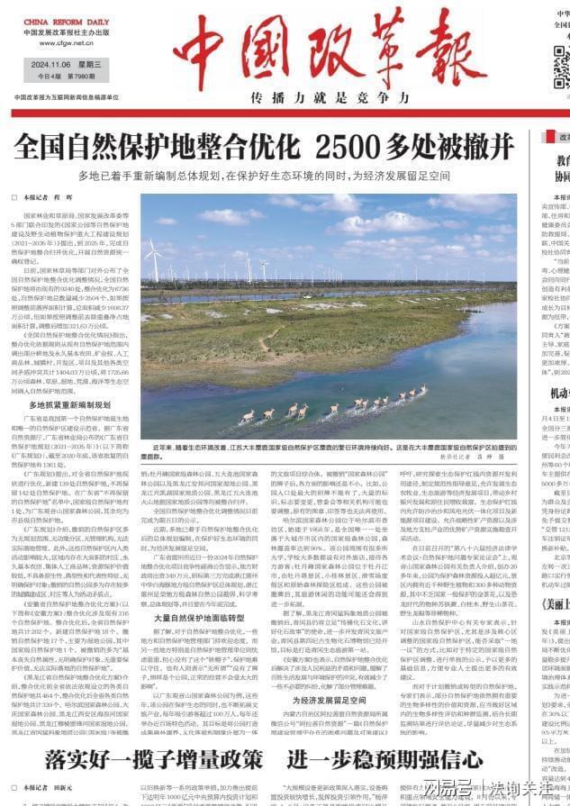 11月6日,《中国改革报》头版头条刊发《全国自然地保护聚合优化 2500多处被合并》,文章最后说:在日前召开的“第八十六届经济法律学术会议·自然保护地问题专家论证会”上,观音山国家森林公园有关负责人介绍,创办20多年来,公园为保护森林资源投入超亿元,景区内拥有近千种野生植物和300多种动物资源,其中不乏国家一级保护的金茶花,以及恐龙时代的物种苏铁蕨、白桂木、野生山茶花、野生龙眼等珍稀物种。 山水自然保护中心有关专家表示,针对国家级自然保护区,尤其是涉及核心区调整的国家级自然保护区,能否采取“一地一议”的方式,比如对于特定的国家级自然保护区调整,进行单独的公示,予以更多的基础信息,方便专业人士提出更多的有效建议。 而对于计划撤销或转型的自然保护地,专家们表示,部分自然保护地依然拥有重要的生物多样性的价值和资源,应当做好区域内的生物多样性评估和种群监测,结合长期监测结果进行评估论证,尽量减少对生态系统的影响。