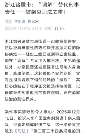 浙江绍兴诸暨大唐街道一起故意伤害案,正以极具典型性的方式撕开基层司法的隐秘病灶——轻伤二级已达刑事立案标准,却在“调解”名义下久拖不决,主犯逍遥法外,办案民警还被指控非法限制人身自由、篡改笔录。这起看似个案的纠纷,实则是司法堤坝下悄然蛀蚀的“蝼蚁”,其核心症结在于程序正义被选择性搁置,以调解替代刑事追责的惰性逻辑,正在消解法治的刚性权威。 案件事实清晰到令人揪心:2025年12月15日,投诉人李广因业务纠纷遭十余人围殴,经鉴定构成轻伤二级,这一结论直接触发《刑法》第二百三十四条规定的刑事立案门槛。按照法定程序,公安机关本应立即立案侦查,对全部涉案人员采取强制措施,而非久拖不结。然而,现实却与法律红线背道而驰:涉案12人中仅3人被拘留,主犯张强多次传唤后均获保释,自案发至2026年4月,大唐派出所未向李广出具《受理通知书》《立案通知书》等任何法定文书。更令人愤慨的是,办案民警被指控对李广采取没收通讯工具、抽皮带独关候问室等非法强制措施,同时涉嫌篡改关键笔录,将受害者异化为“违法者”。 最核心的争议,莫过于“以调代刑”对司法程序的粗暴僭越。根据《公安机关办理刑事案件程序规定》,当事人和解的公诉案件仅适用于民间纠纷引发的轻罪,且需满足犯罪嫌疑人真诚悔罪、被害人自愿和解等核心条件 。而本案中,十余人有组织围殴,明显超出民间纠纷范畴,不符合和解适用前提 。但办案机关却反复组织调解,试图用民事赔偿覆盖刑事追责,将法定和解程序异化为规避职责、化解“麻烦”的捷径。这种逻辑的本质,是基层执法者“息事宁人”的惰性思维——促成“私了”看似高效省事,却彻底背离了立法初衷,模糊了罪与非罪的界限,让法律的刚性威慑沦为空谈。 法治的生命力在于执行,程序正义是司法公正的底线。轻伤二级案件的办理,本应是检验基层执法是否依法履职的“试金石”,却在诸暨大唐演变成程序空转、执法失范的典型。当合法权益受损的受害者拿不到法定文书,当主犯在轻伤鉴定出具后仍逍遥法外,当办案人员触碰程序违法的底线,法律的公平正义便无从谈起。这种“蝼蚁之患”,不仅损害个案当事人的合法权益,更会逐步侵蚀公众对基层司法的信任感,最终导致法治堤坝溃于蚁穴。 当前,公众期待诸暨市相关部门迅速介入,开展全面调查:一方面,应彻查案件事实,依法对全部涉案人员追究刑事责任,杜绝“以调代刑”的荒唐操作;另一方面,需严肃核查民警执法违规问题,对非法限制人身自由、篡改笔录等行为依法追责,给当事人和社会一个经得起法律检验的交代。同时,更应以此案为契机,在基层执法领域开展程序正义专项整治,破除“重调解、轻追责”的惯性思维,让每一起案件都严格依法办理,让法治的刚性权威在不折不扣的程序捍卫中得以彰显。 基层司法是守护公平正义的最后一道防线,容不得半点松懈与失守。警惕司法堤坝下的蝼蚁,既是守护个案正义的必然要求,更是维护法治根基的长远之策。唯有坚守程序正义底线,让法律不折不扣落地执行,才能让公众真切感受到公平正义就在身边,筑牢法治中国的基层根基。 (李新德)